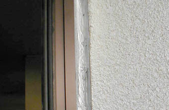 この様に外壁カット部分の下地とサッシ枠の間を防水テープとシーリングによる一次防水を施し、