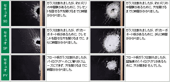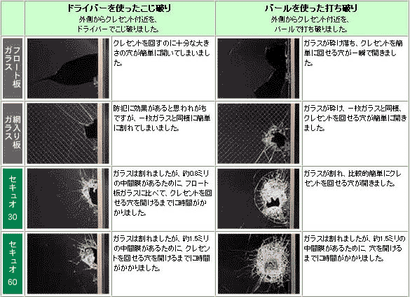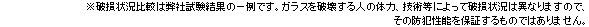 性能面での評価が 防犯ガラスの破壊実験に掲載してございます。