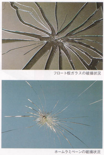 写真は日本板硝子の【ホームラミペーン(R)】という住宅用の最も一般的な合わせガラスの破損状況です。