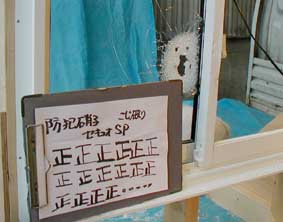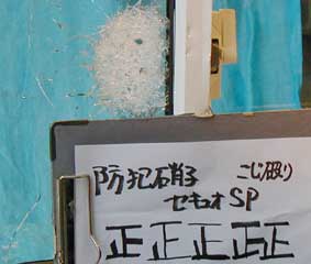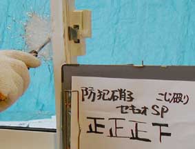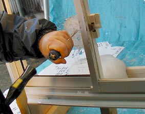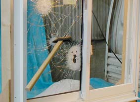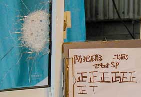 左の写真はこじ破りではどうしてもクレセントを回すだけの穴が確保できないので、参加者がボチボチ切れてきて、何が何でも穴を広げるとばかりにハンマーの先の細い方をガラスに向けて強打しました。 |