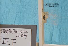 数回のコジでガラスにヒビが入りました。しかしフィルムがガラスに接着しているため穴は空きません