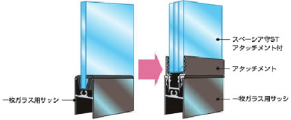 ガラス溝の狭いサッシに取替え用途としてアタッチメント(アダプター)を用意しています。 今お住いの一枚ガラス用サッシにそのまま、ガラスを取替えるだけで短時間・簡単ガラスリフォームが可能です。 ※ アタッチメントをご使用になる場合、遮音性能は充分に発揮されません。 ※ スペーシア守に交換することでガラス面の結露は軽減できますが、サッシ部分の結露は防げませんので、断熱サッシをご検討下さい。 |