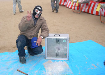そして嶋氏は急遽パフォーマンスに参加、あやしい泥棒役で防犯ガラスのセキュオ90をガンガン叩き割る。